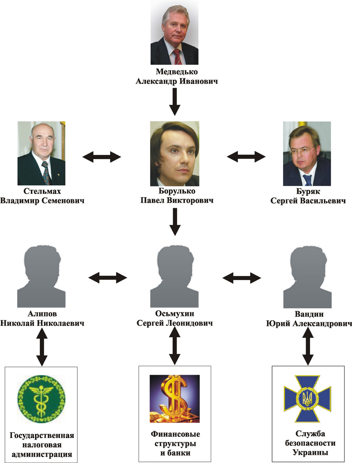 Александр Медведько, организовавший и возглавляющий теневую финансовую систему, осуществляет ее "правовое" прикрытие. Находясь в стороне от денежных махинаций, он имеет свою солидную долю от каждой проведенной сделки. Общее управление, координацию и контроль денежных потоков, а также поддержание связей с "банковской крышей" из НБУ выполняет Павел Борулько. Глава Национального банка Украины Владимир Стельмах, состоявший ранее в наблюдательном совете "Брокбизнесбанка", предоставляет полное и всецелое прикрытие всех банковских операций связанных с отмыванием "грязных" денег. Важную роль играет глава Департамента валютного регулирования и лицензирования НБУ – Александр Белоненко. Активно используя ресурс Национального банка, как финансового регулятора, он создает благоприятные условия для "опекаемых" банков и всячески блокирует нормальную деятельность всех остальных. Невиданную лояльность ГНА обеспечивает ее нынешний руководитель Сергей Буряк, давно уже имеющий славу "отмывщика". Непосредственно финансовыми вопросами и контролем за движением средств занимается владелец ОАО "Финексбанк" Сергей Осьмухин. Поддерживая тесный контакт с Юрием Вандиным, Николаем Алиповым, заместителем прокурора г. Киева Вадимом Гораном и другими представителями силовых структур, он решает практические вопросы, обеспечивая бесперебойное и безопасное функционирование конвертационных центров, а также переправку валюты через границу в Россию, Латвию и другие страны ближнего и дальнего зарубежья.