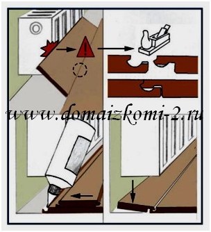 Часто бывает, что в ходе укладки ламината возникает помеха для свободной сборки панелей из-за выступающих предметов. В часности, радиаторов парового отопления.