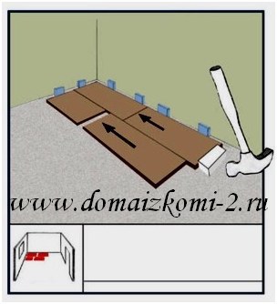 Ламинат укладывается замком на себя для облегчения защелкивания панелей.